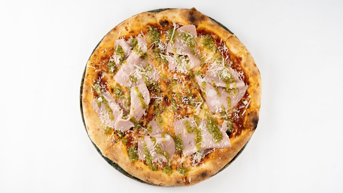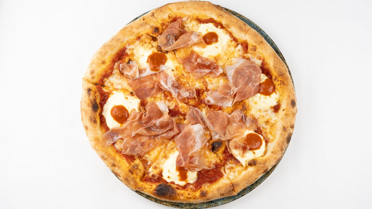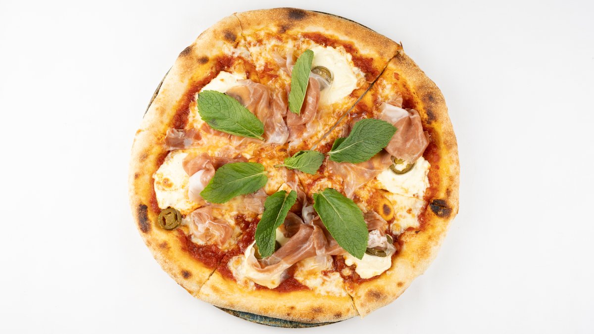 Sos z pomidorów san marzano, mozzarella fior di latte, prosciutto di parma, jalapeño, mascarpone, mięta