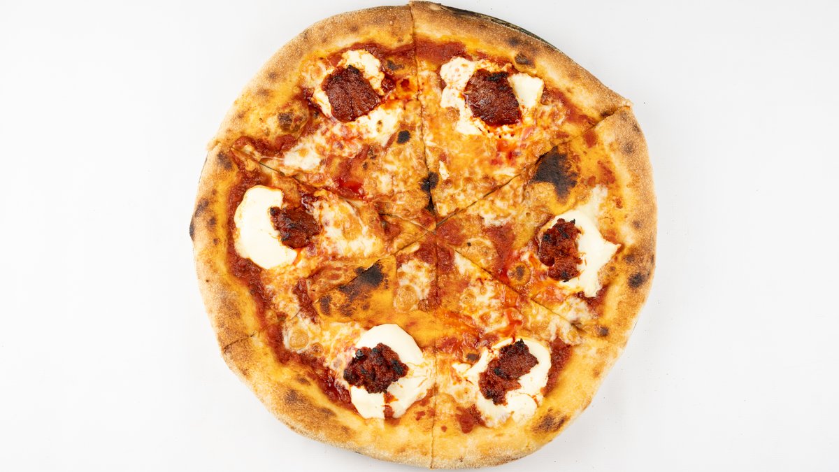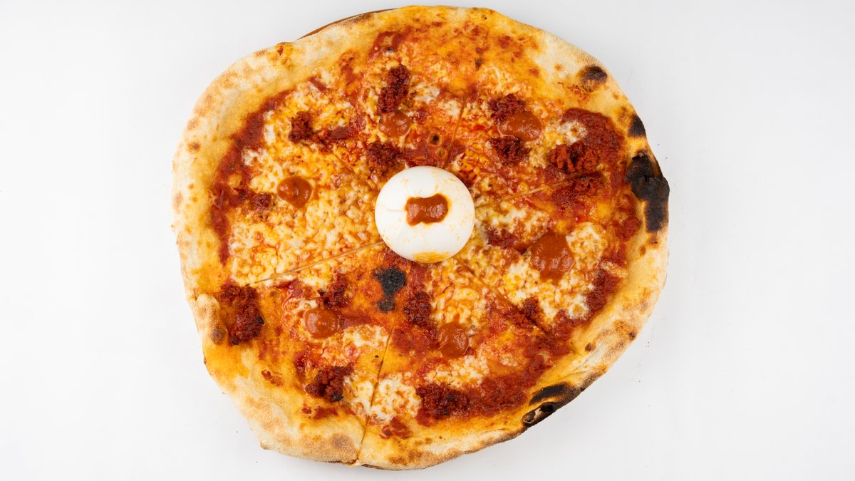 Sos z pomidorów san marzano, mozzarella fior di latte, 'nduja, autorski sos ostry, buratta