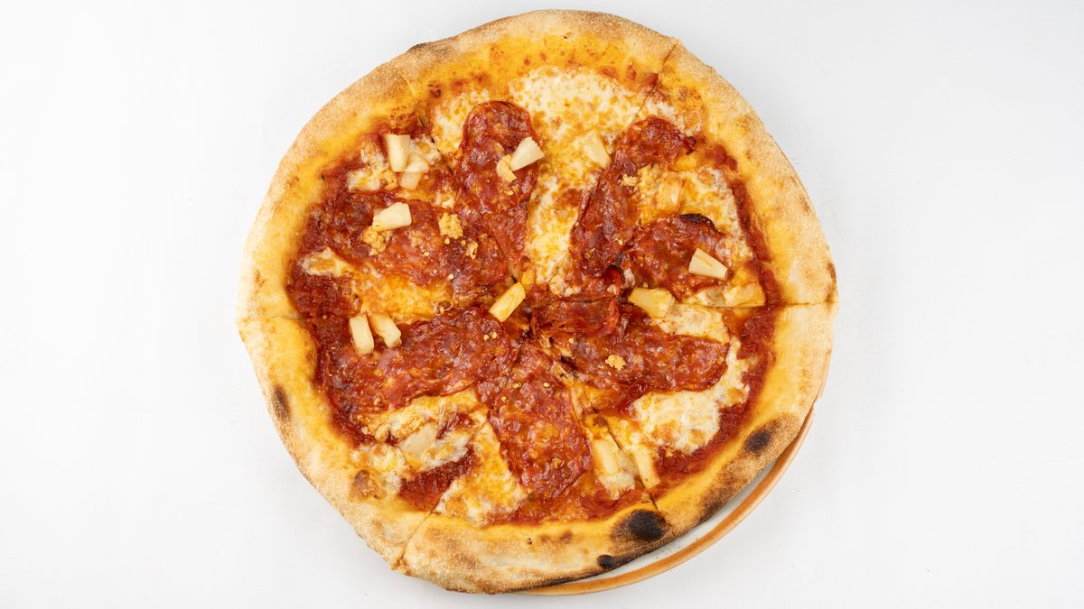 Sos z pomidorów san marzano, mozzarella fior di latte, spianata picante, ananas, czosnek, peperoncino