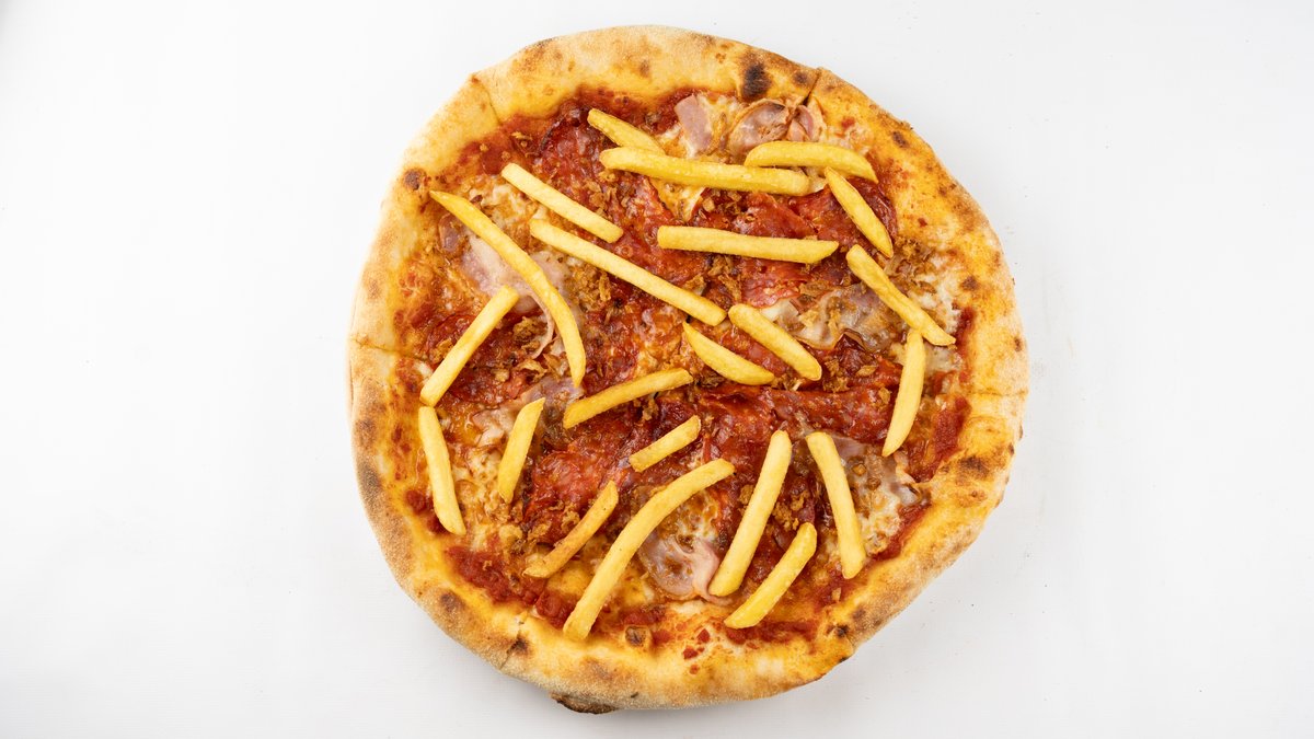 Sos z pomidorów san marzano, mozzarella fior di latte, bekon, frytki, spianata, prażona cebulka