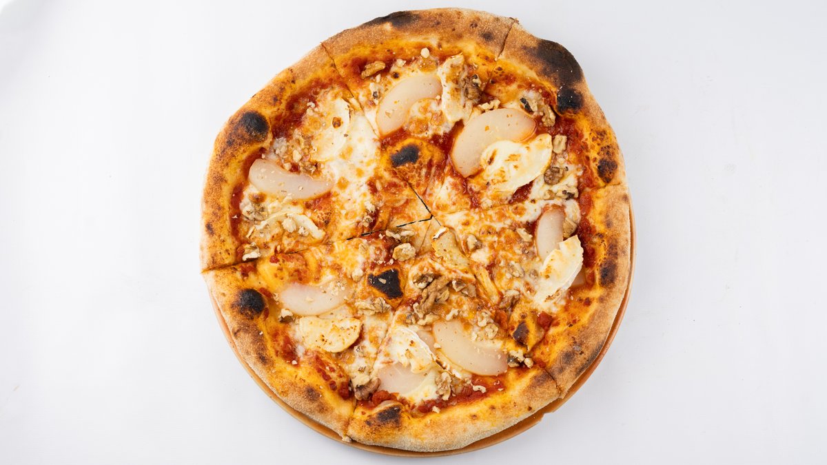 Sos z pomidorów san marzano, mozzarella fior di latte, gruszka, peperoncino, orzechy włoskie, ser kozi