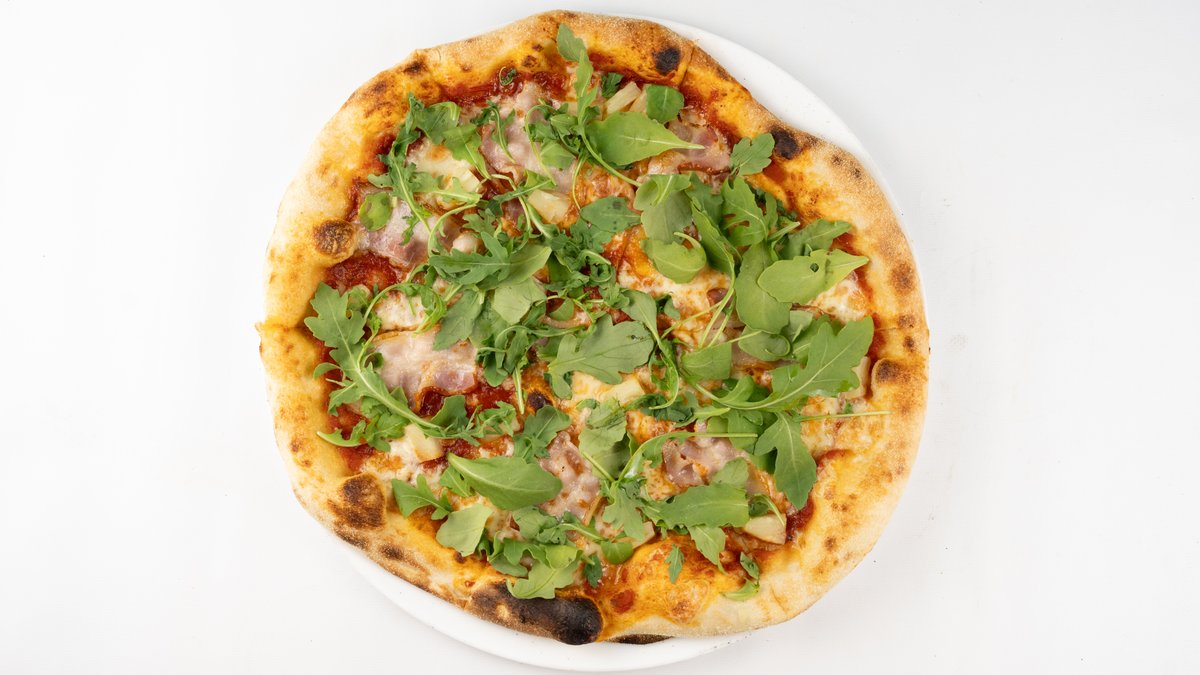 Sos z pomidorów san marzano, mozzarella fior di latte, boczek, ananas, jalapeño, rukola