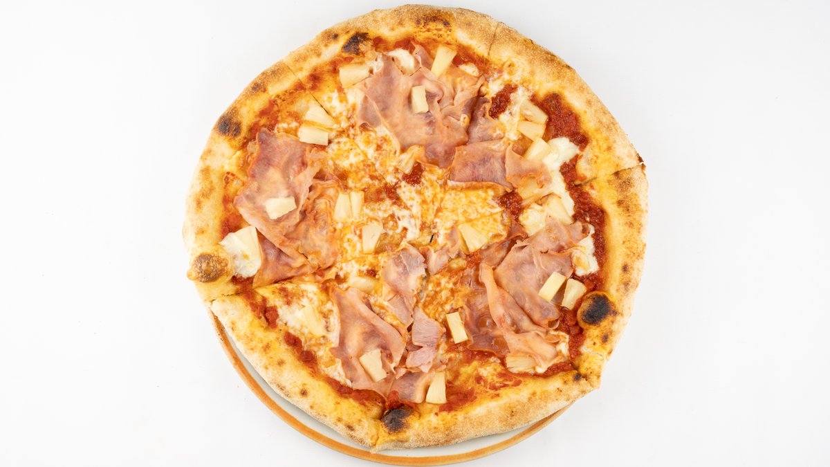 Sos z pomidorów san marzano, mozzarella fior di latte, prosciutto cotto, ananas