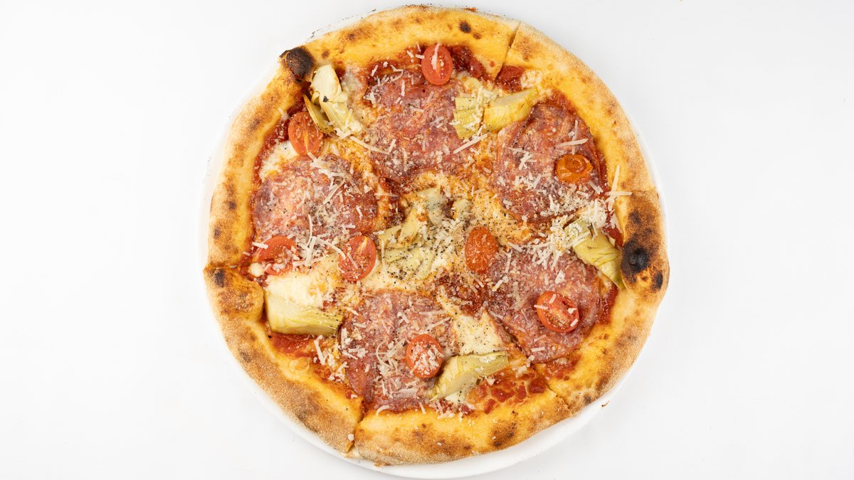 Sos z pomidorów san marzano, mozzarella fior di latte, salami, karczochy, pieprz, pomidorki, parmezan