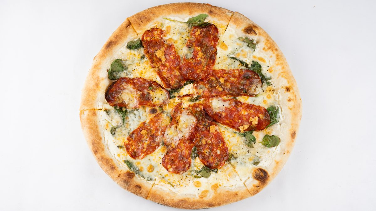 Sos śmietanowo-serowy z pieprzem, mozzarella fior di latte, salami spianata, gorgonzola, szpinak