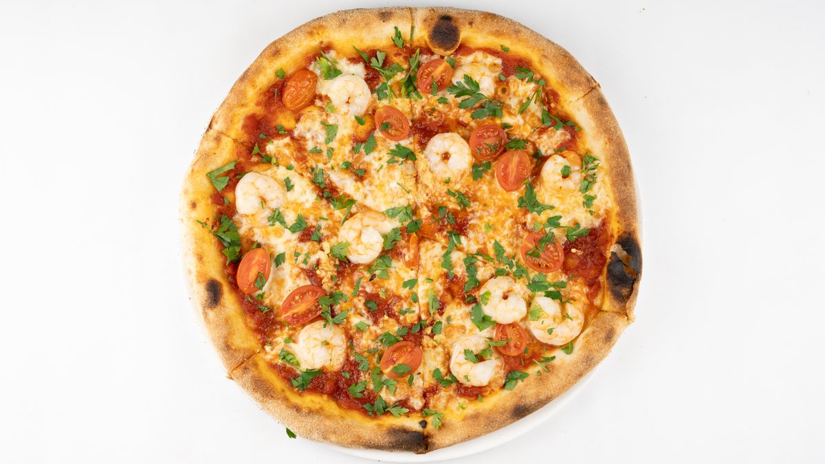Sos z pomidorów san marzano, mozzarella fior di latte, krewetki, pomidor koktajolwy, czosnek, peperoncino, natka pietruszki