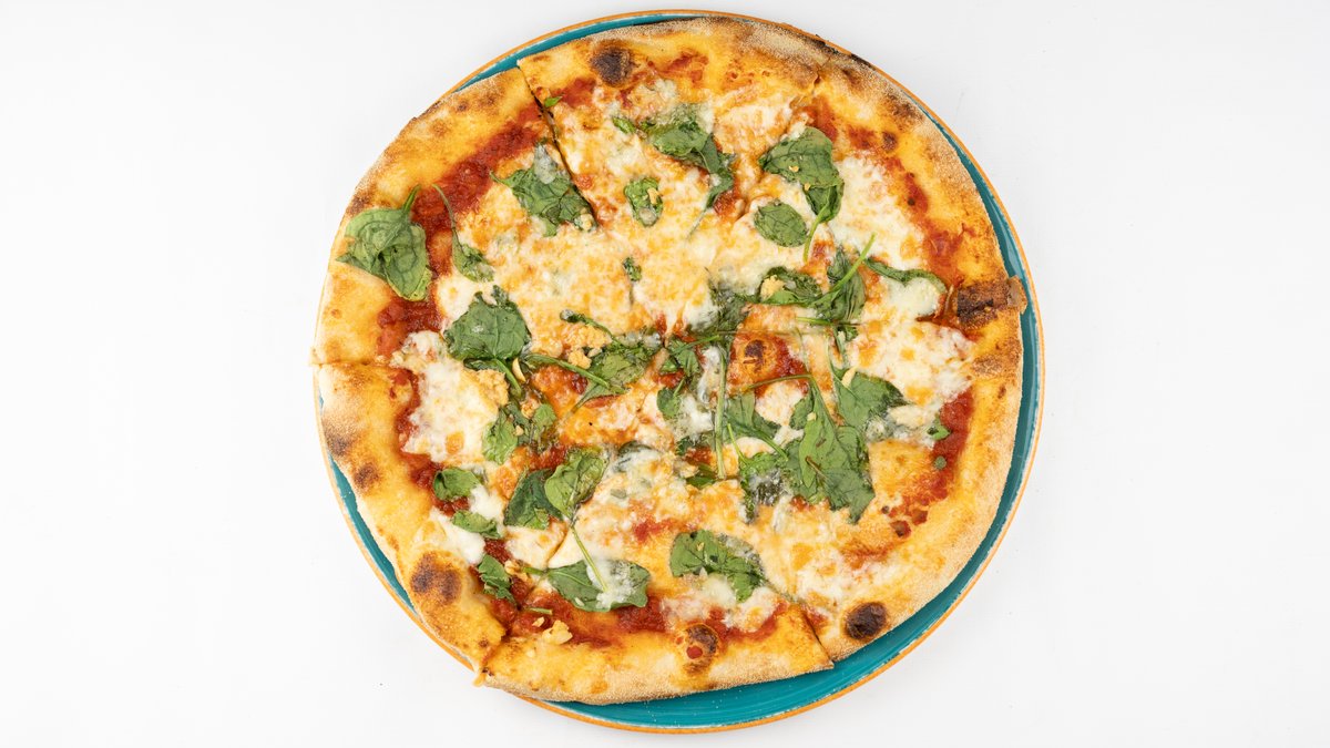Sos z pomidorów san marzano, mozzarella fior di latte, szpinak, czosnek, gorgonzola
