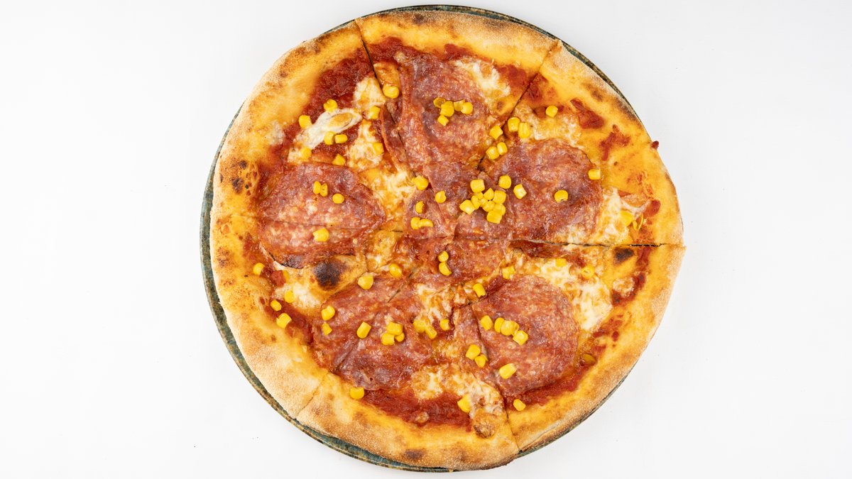 Sos z pomidorów san marzano, mozzarella fior di latte, salami finocchiona, kukurydza