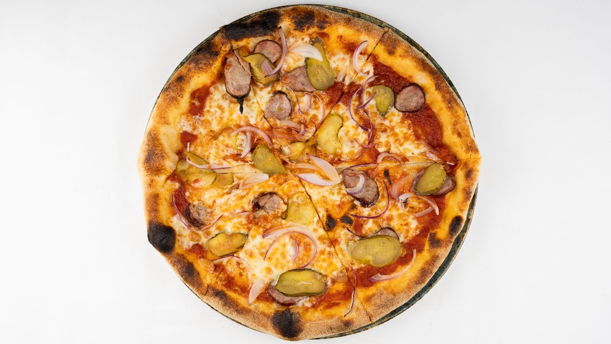 Sos z pomidorów san marzano, mozzarella fior di latte, wiejska kiełbasa, cebula, ogórek konserwowy