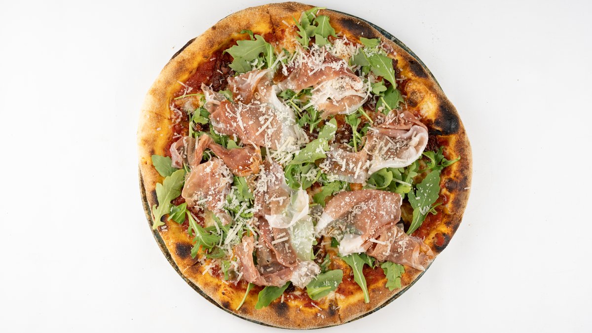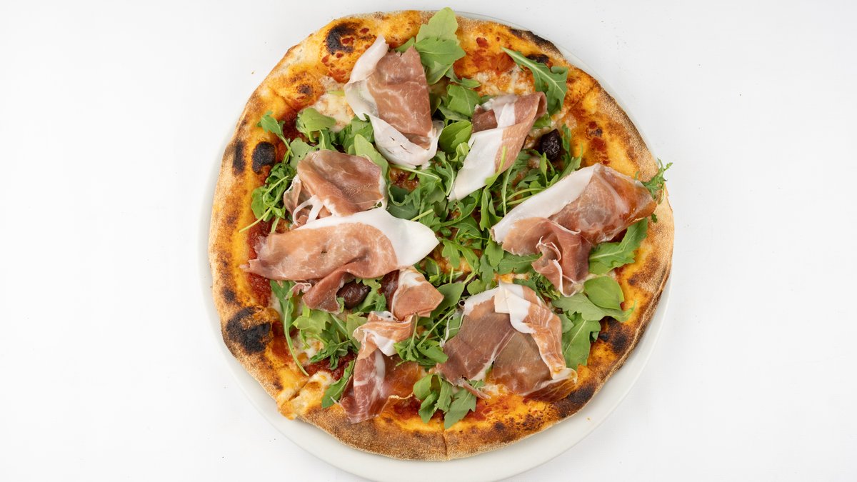 Sos z pomidorów san marzano, mozzarella fior di latte, prosciutto di parma, oliwki, rukola