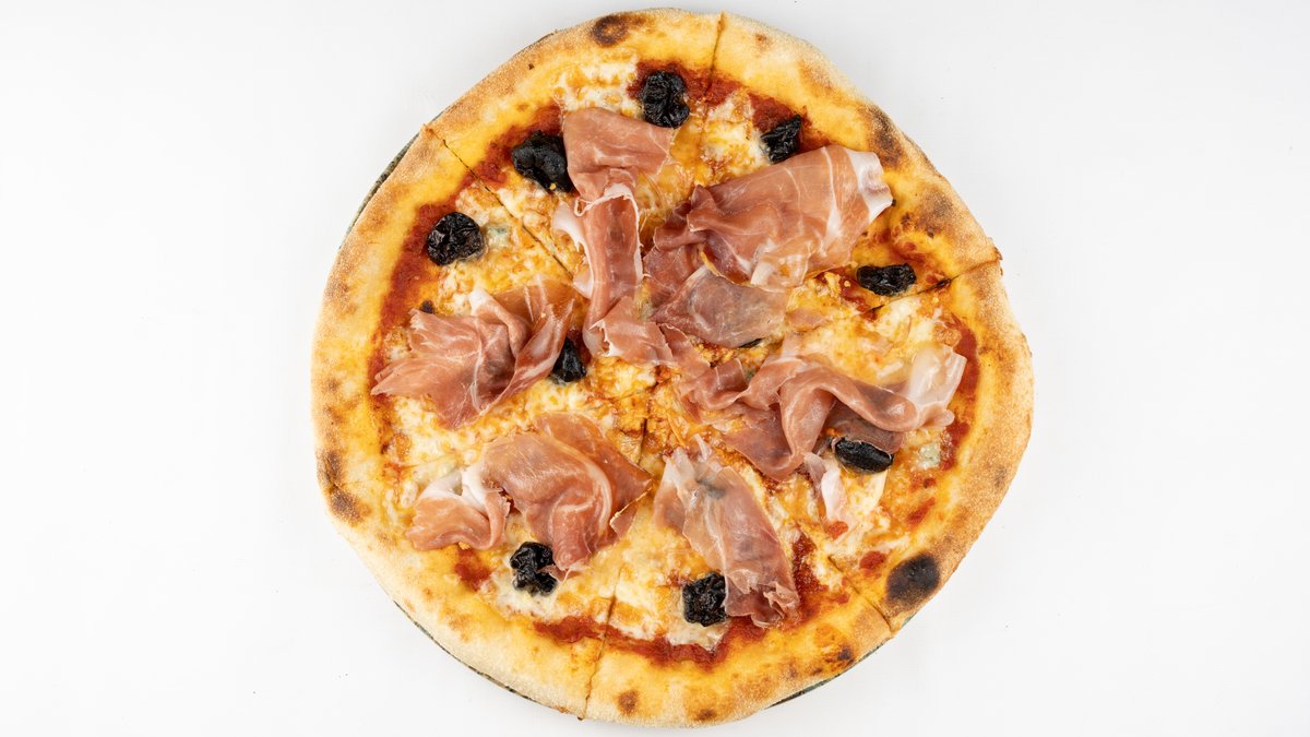 Sos z pomoidoró san marzano, mozzarella fior di latte, camembert, suszona śliwka, peperoncino, czosnek, gorgonzola, szynka parmeńska