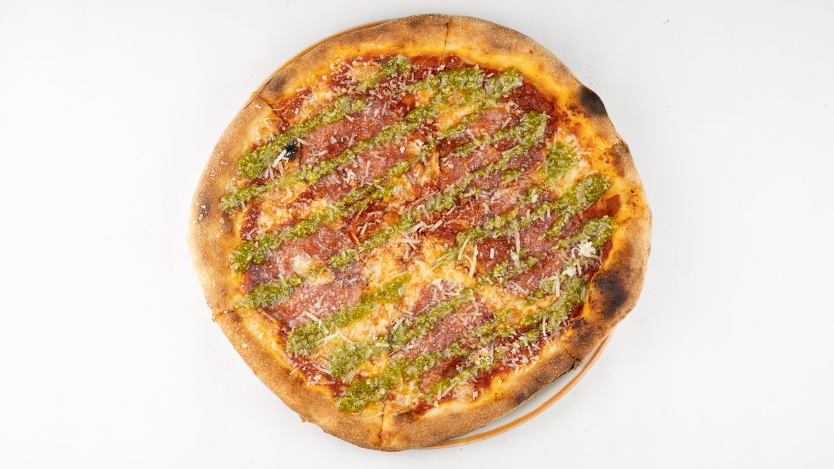 Sos z pomidorów san marzano, mozzarella fior di latte, salami finocchiona, parmezan, pesto pistacjowe