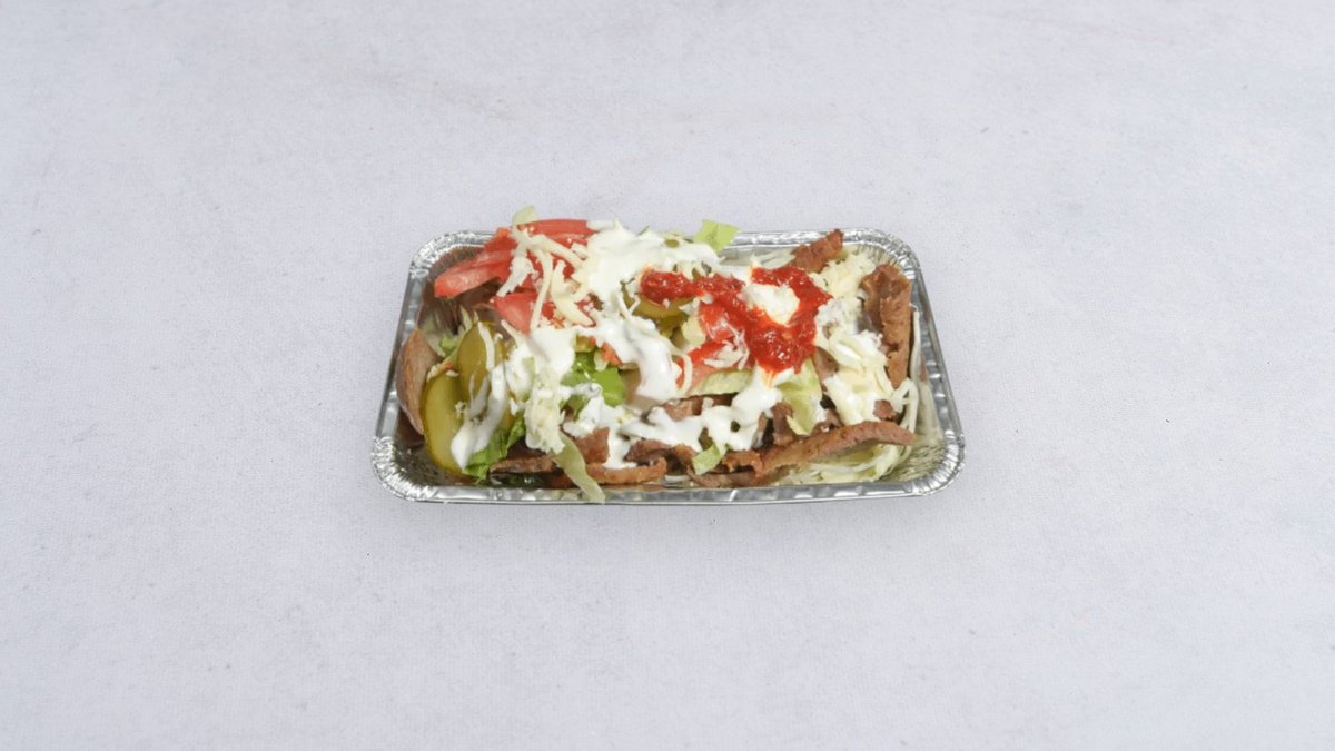 Mięso, frytki, ser, sałata, pomidory, cebula, sos