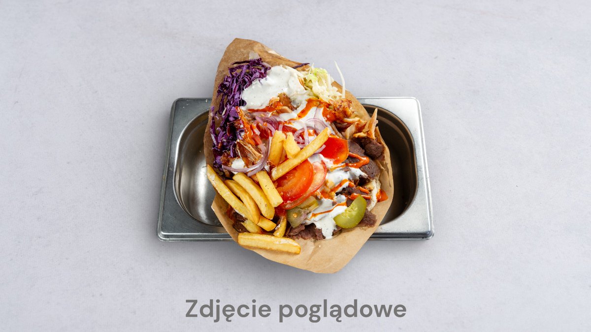 Tortilla z drobiem i wieprzem, dwoma sosami do wyboru, sałatą, cebulą, ogórkiem, papryką, pomidorem.