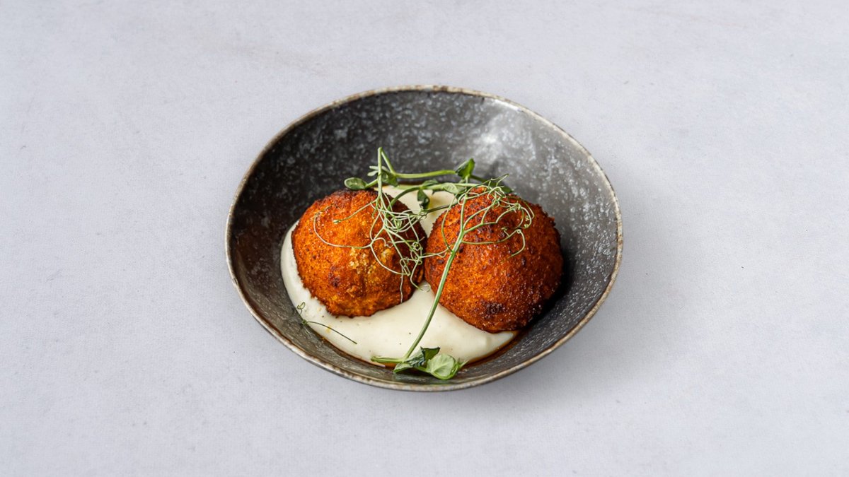 Smażone kulki z pomidorowym risotto 2 szt., 'nduja, gorgonzola, beszamel parmezanowy, oliwa pikantna