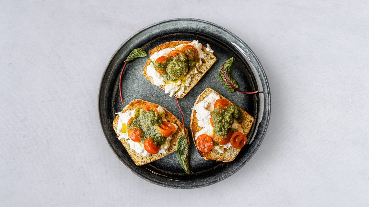 Grzanki z chleba własnego wyrobu, konfitowane pomidorki, burrata, czosnek, zielone pesto