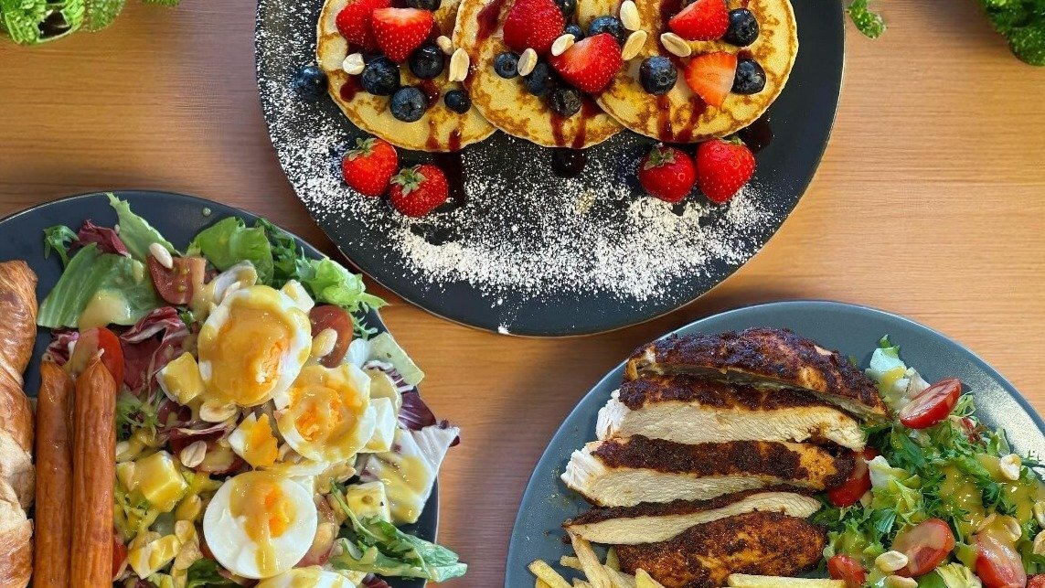 Dwie sztuki tostów, mozzarella, pomidor, rukola, awokado + ketchup Sałatka rukola, pomidorki koktajlowe, orzeszki ziemne, sos miodowo-musztardowy