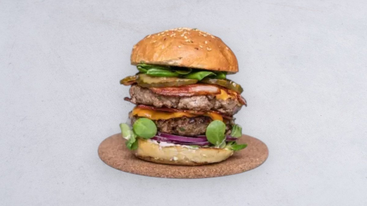 2x Wołowina z sosem białym, sosem BBQ, 2x serem cheddar, 2x bekonem, czerwoną cebulą, piklami z ogórka i roszponką