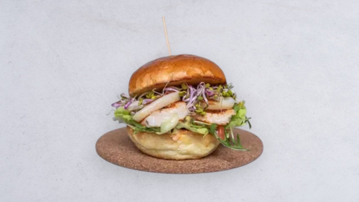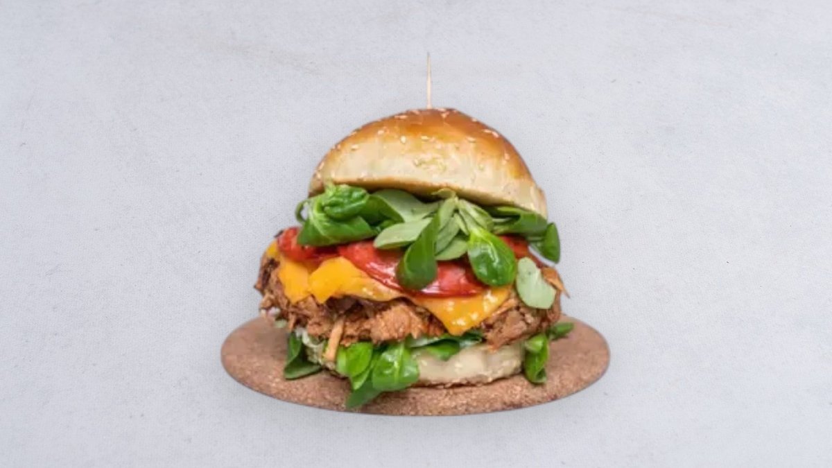 100 % wołowina z sosem różowym, chutney porzeczkowo-imbirowym, piklami z ogórka, mandarynką, serem camembert, sosem BBQ i rukolą