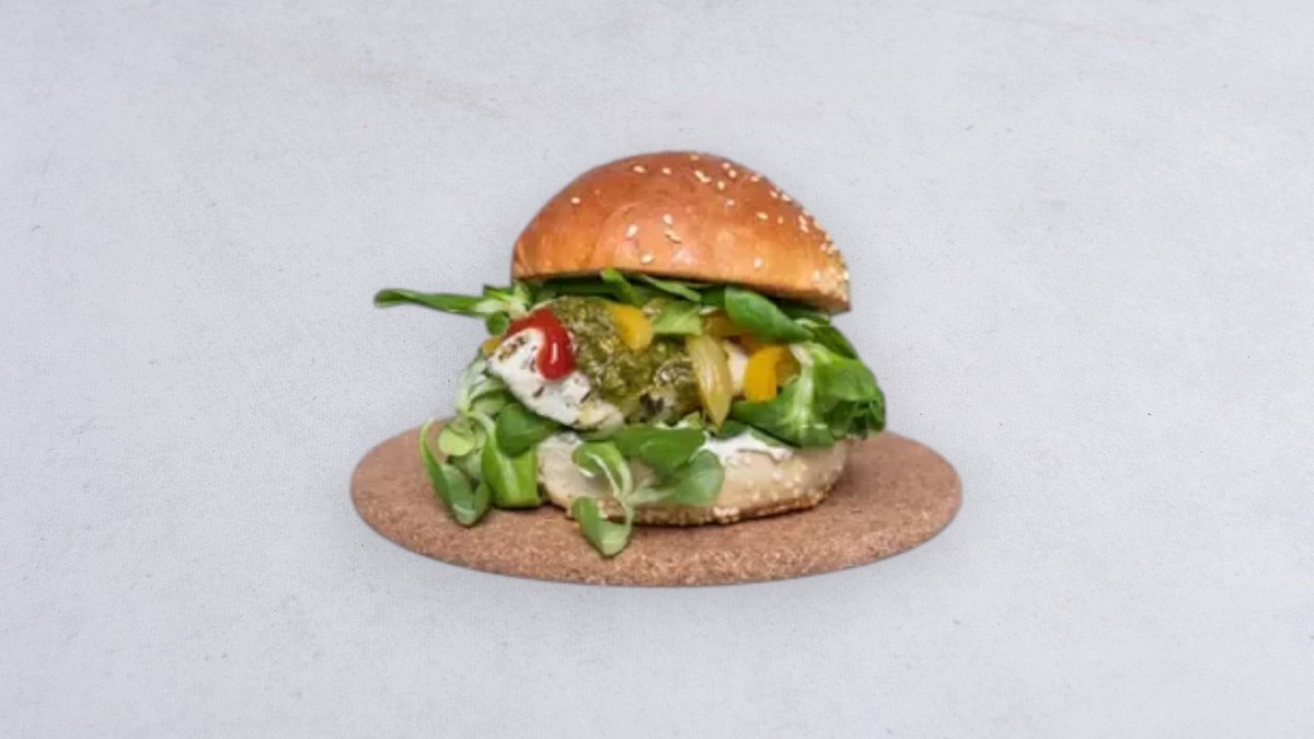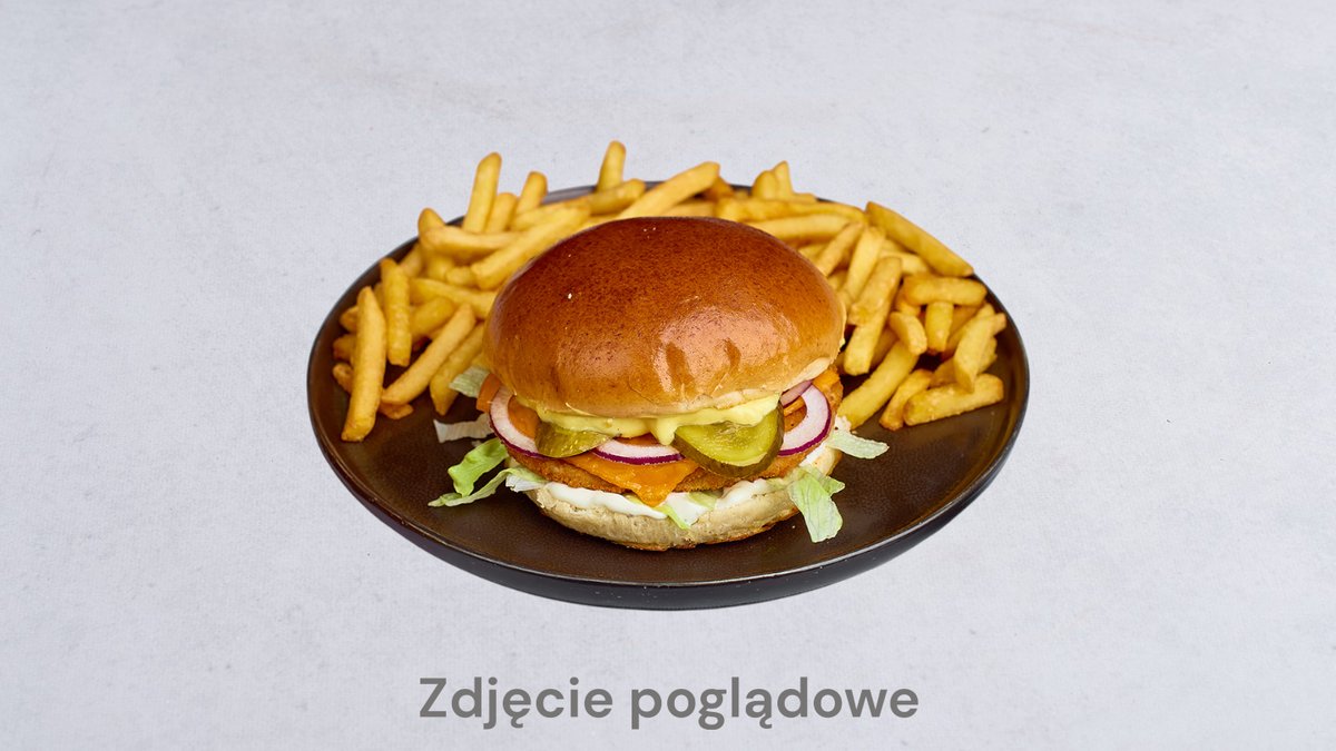 Z kotletem wege, sosem białym, sosem pomidorowym, pomidorem, sałatą, frytkami i surówką colesław w bułce