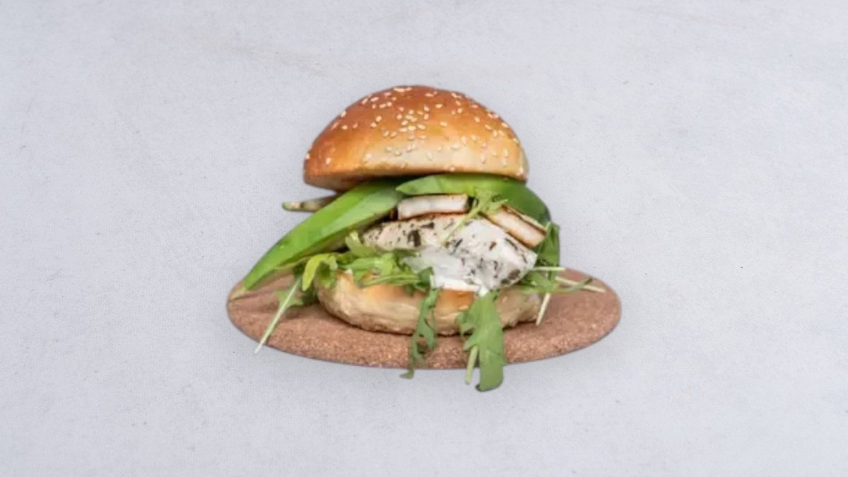 Z kurczakiem grillowanym, sosem białym, ajwarem, serem halloumi, awokado i rukolą