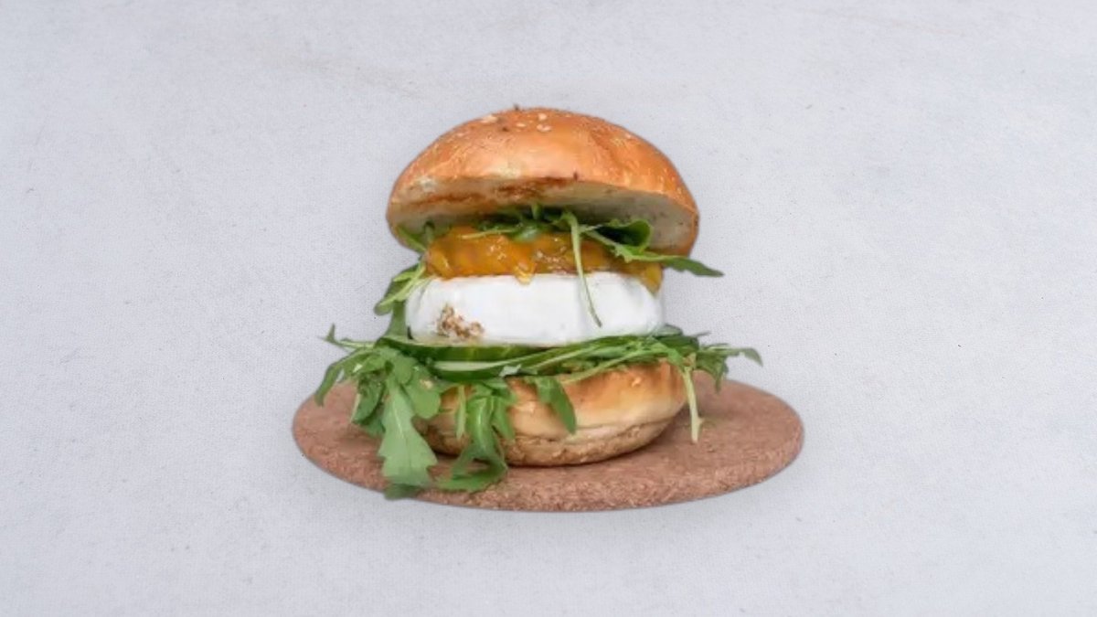 Z grillowanym serem camembert, sosem różowym, rukolą i konfiturą owocową