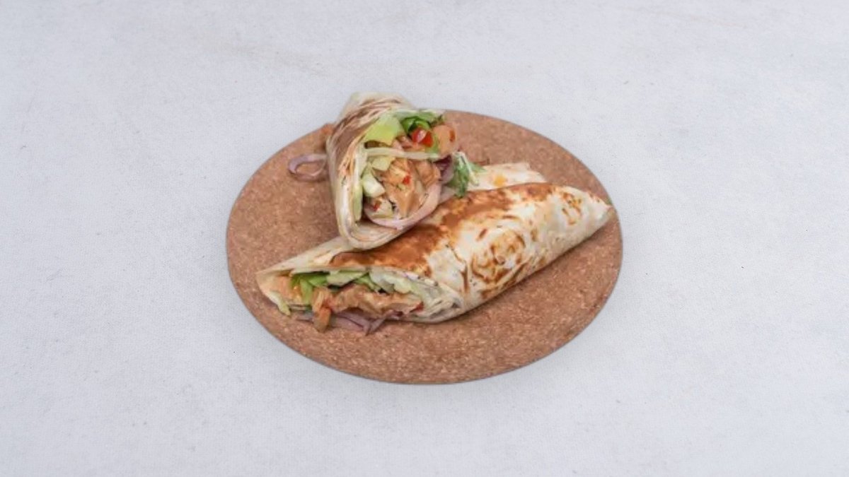 Tortilla, kotlet sojowy, sałata lodowa, rukola, ogórek zielony, cebula, majonez wegański i sos słodko-kwaśny