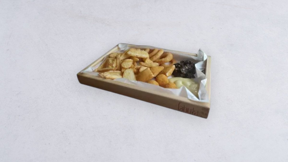 Z frytkami, serkiem nachos, kulkami serowymi, krążkami cebulowymi, dipem jogurtowo-oliwkowym i salsą