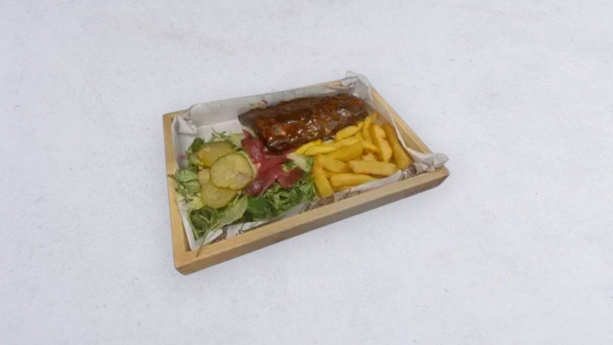 Z żeberkami w sosie BBQ, frytkami belgijskimi, ajwarem, piklami z ogórka i mixem sałat