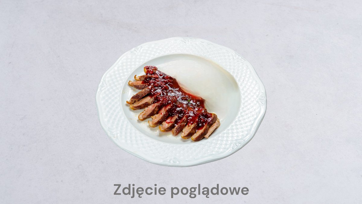 Ryż, filet z kaczki, sos wiśniowy i mix sałat