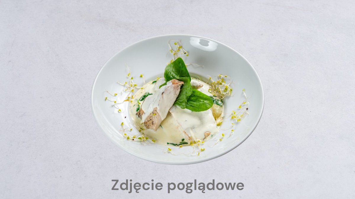 Ryż, pierś z kurczaka sous vide, sos z zielonego pieprzu i surówka