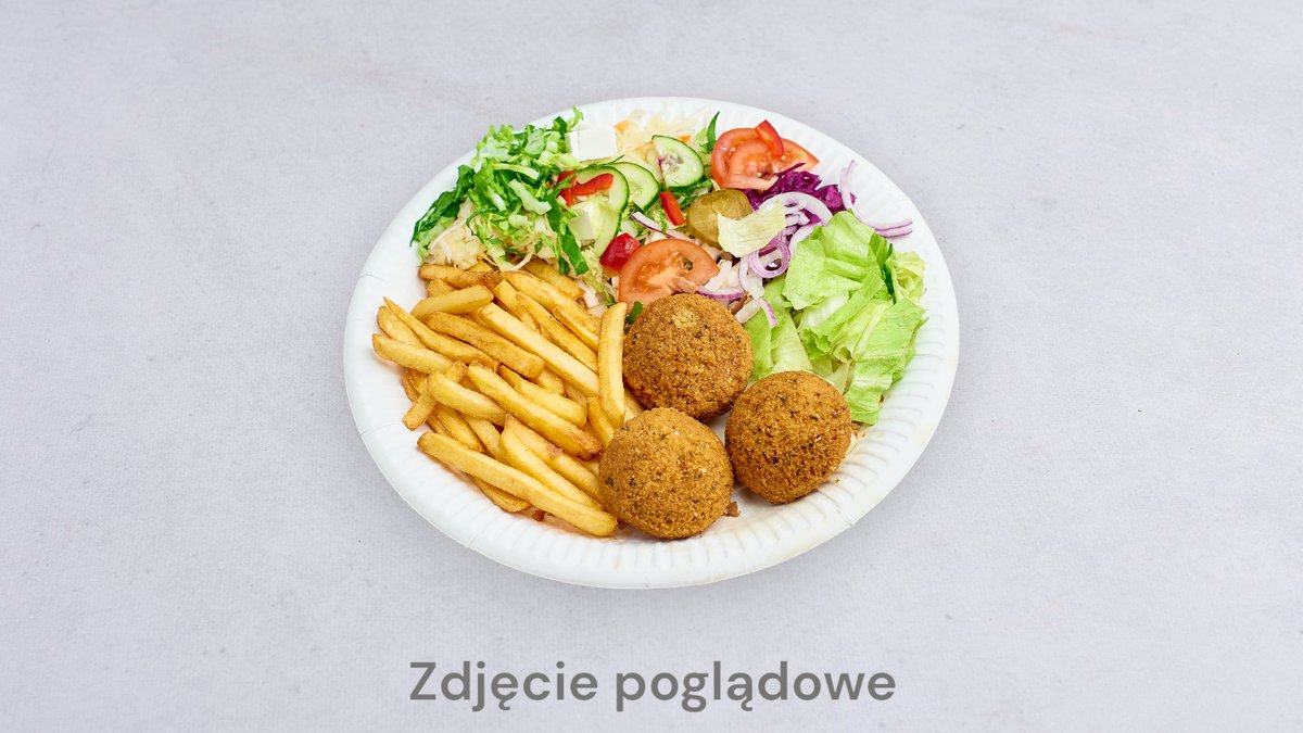 Falafel, chrupiące frytki, świeża surówka, sos