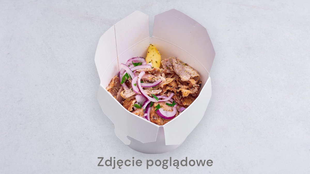 Mięso, frytki, surówka firmowa, ogórek, pomidor, sos