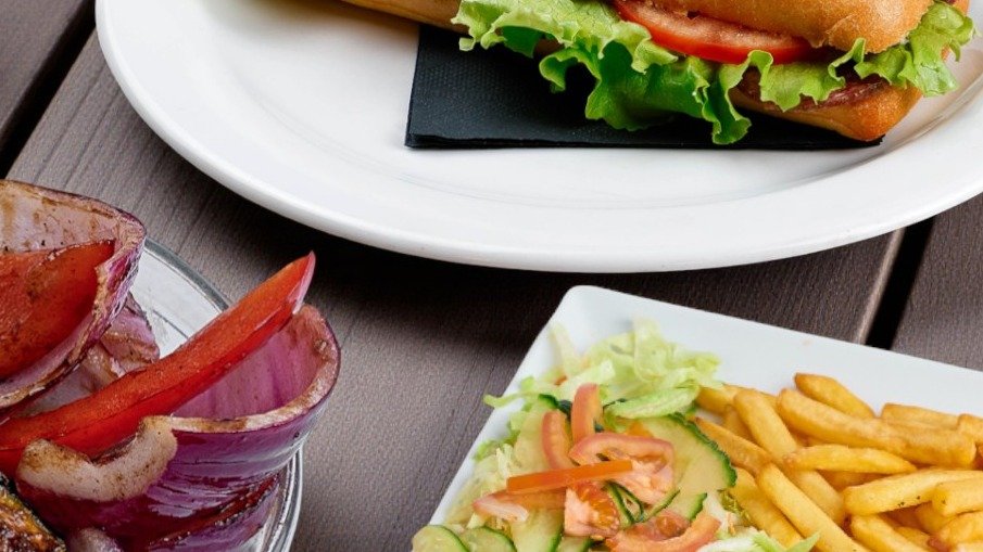 Prażona cebula, zestaw surówek. Rodzaj mięsa, sos i dodatek do wyboru