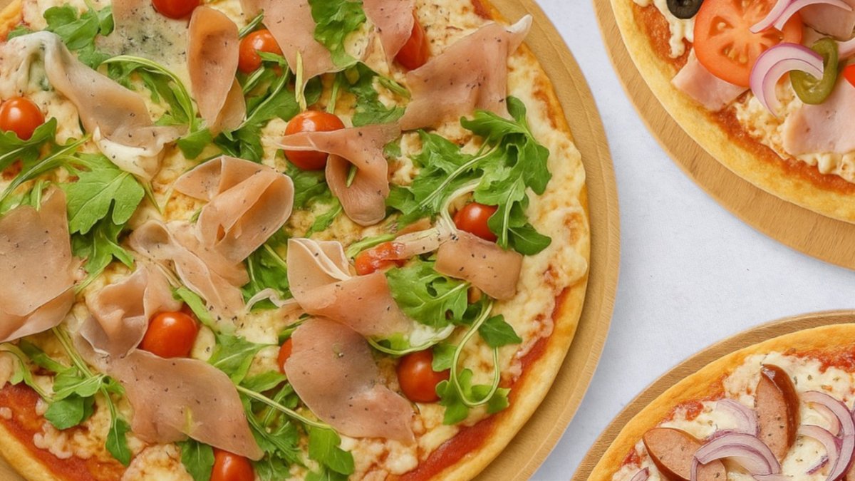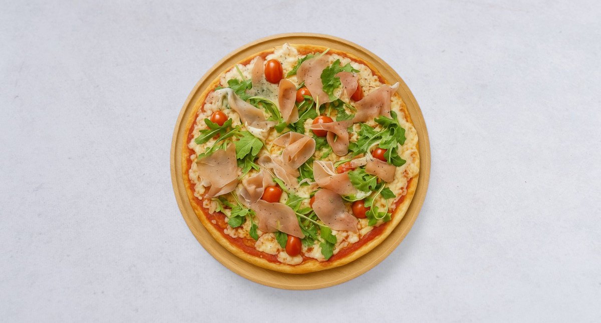 Ciasto, sos pomidorowy, ser, pomidorki koktajlowe, rukola, prosciutto, bazylia