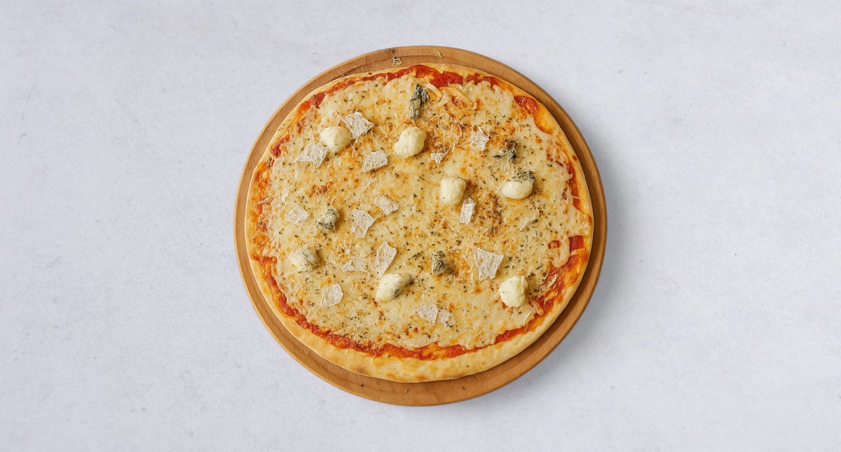 Ciasto, sos pomidorowy, mozzarella, dor blue, camembert, radomer, bazylia