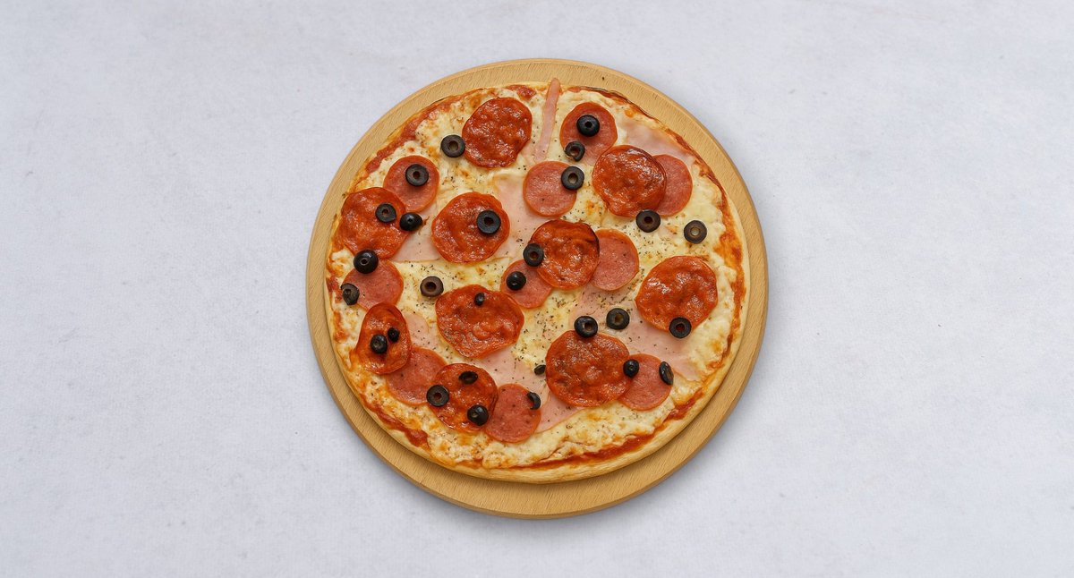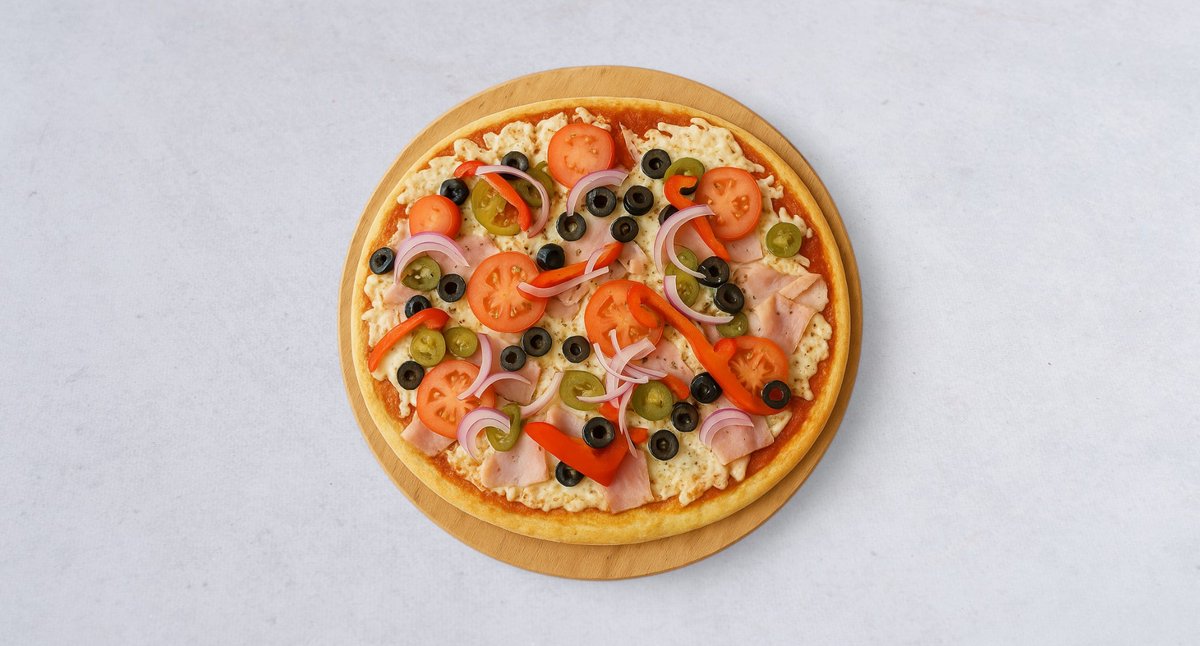 Ciasto, sos pomidorowy, ser, oliwki, niebieska cebula, papryka, pomidor, szynka, boczek, papryczka jalopeño