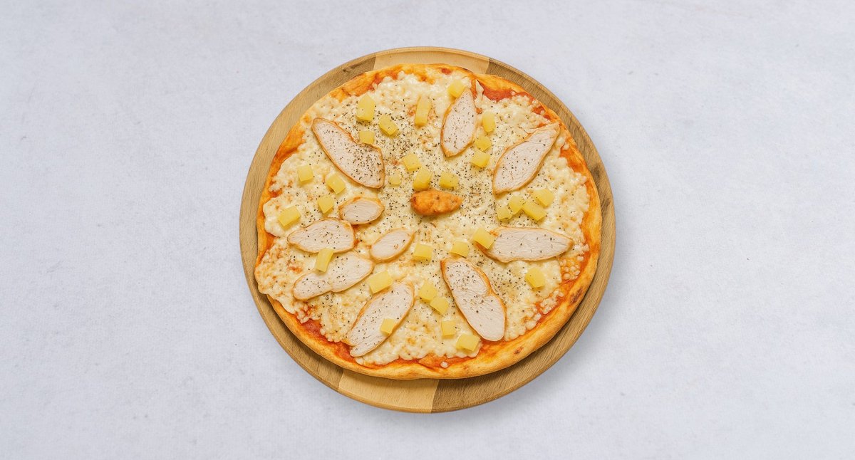 Ciasto, sos pomidorowy, ser, kurczak, ananas, bazylia