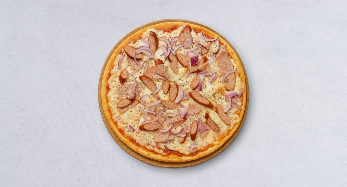Ciasto, sos pomidorowy, ser, kiełbaski myśliwskie, niebieska cebula, boczek, bazylia