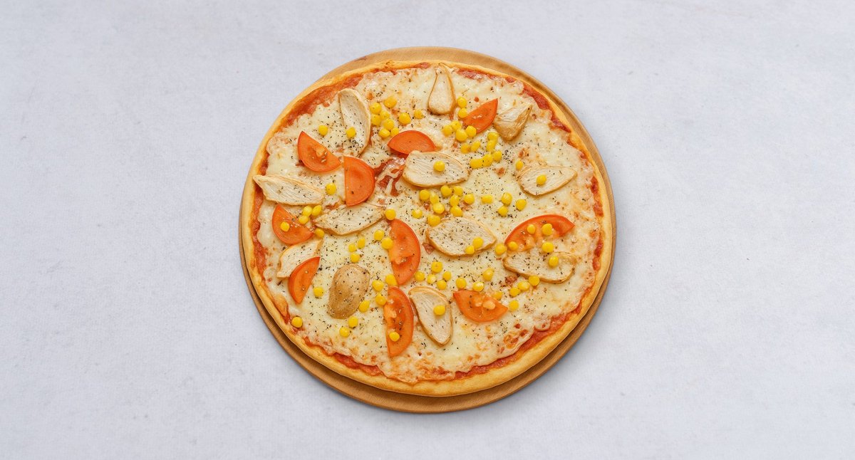 Ciasto, sos pomidorowy, ser, kurczak, kukurydza, bazylia