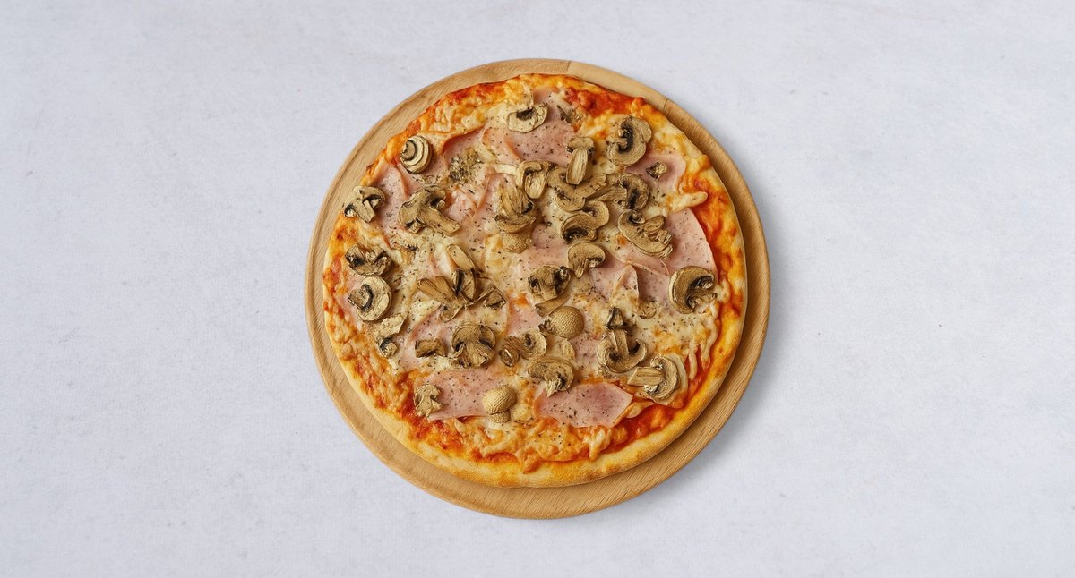 Ciasto, sos pomidorowy ser, szynka, pieczarki, bazylia