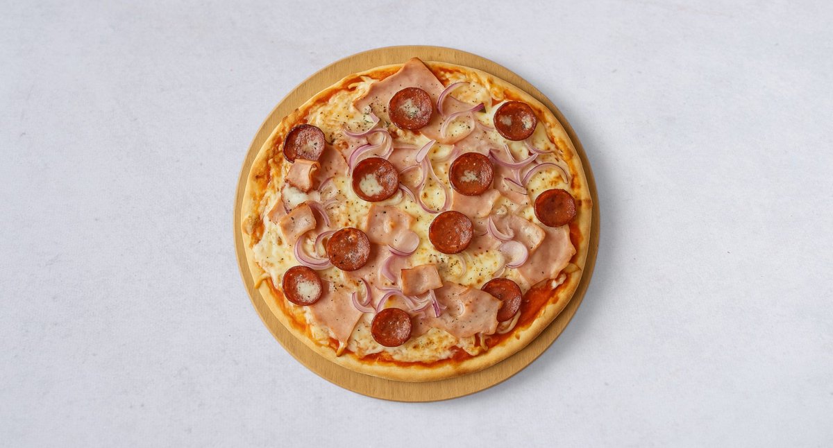 Ciasto, sos pomidorowy ser, szynka, boczek salami, niebieska cebula, śmietana, bazylia