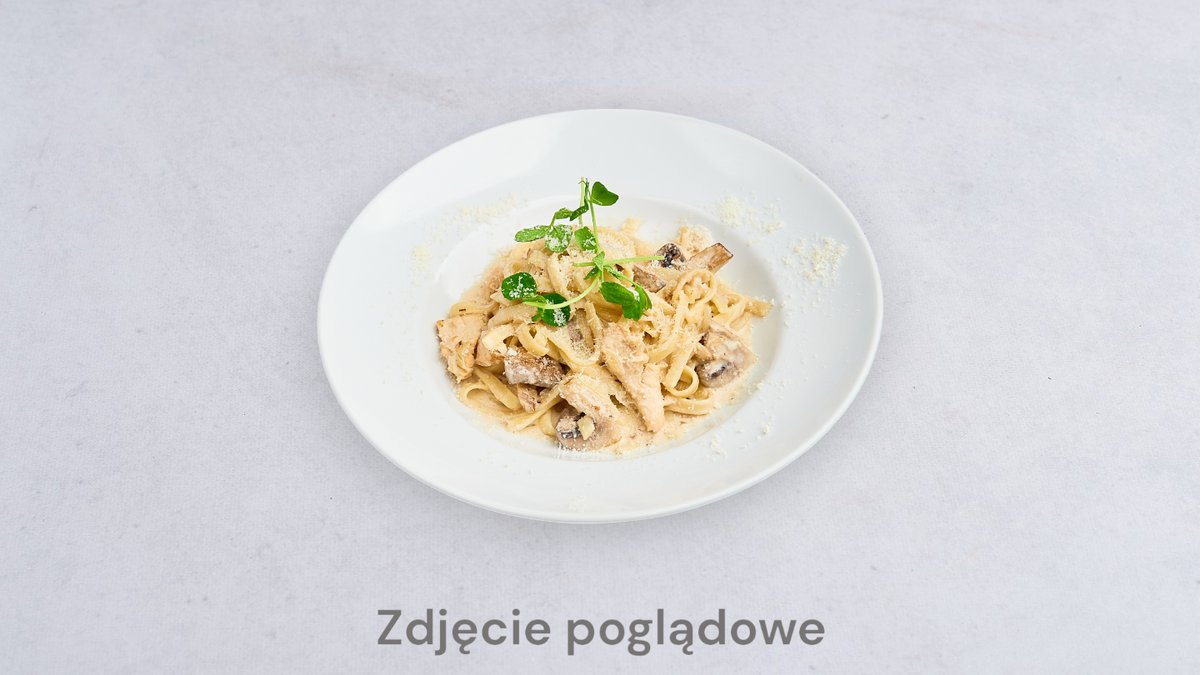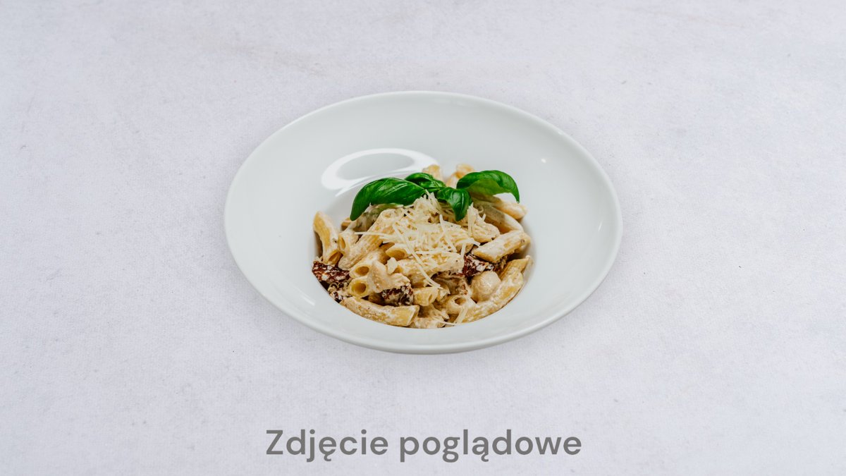Makaron, kawałki kurczaka, suszone pomidory, sos śmietanowo ziołowy