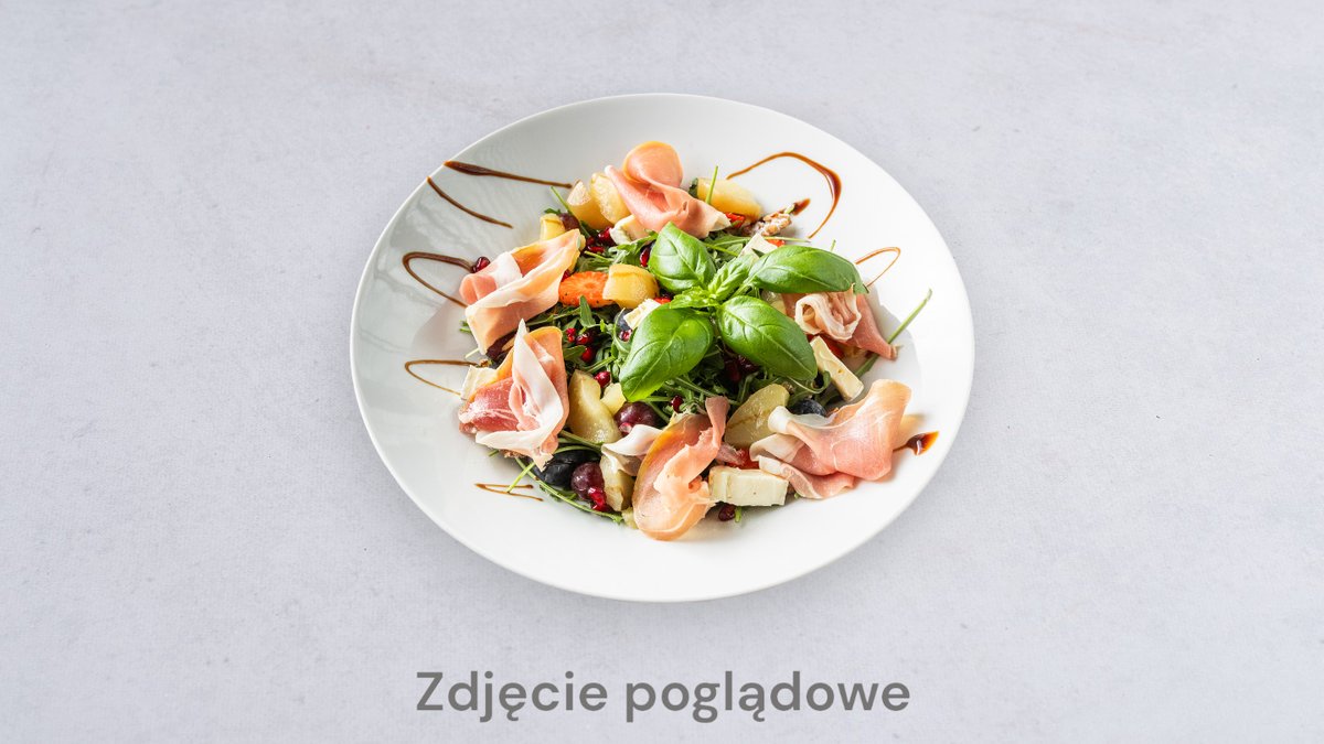 Sałaty, gruszka, pomidorki, szynka parmeńska, ser brie, dip musztardowo miodowy