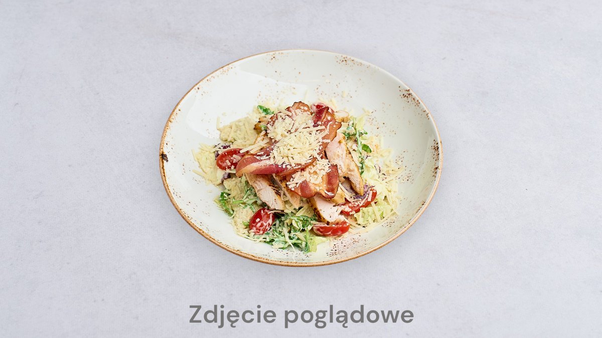 Sałaty, kawałki kurczaka, pomidorki, cebulka, ogórek, dip majo-ketchup