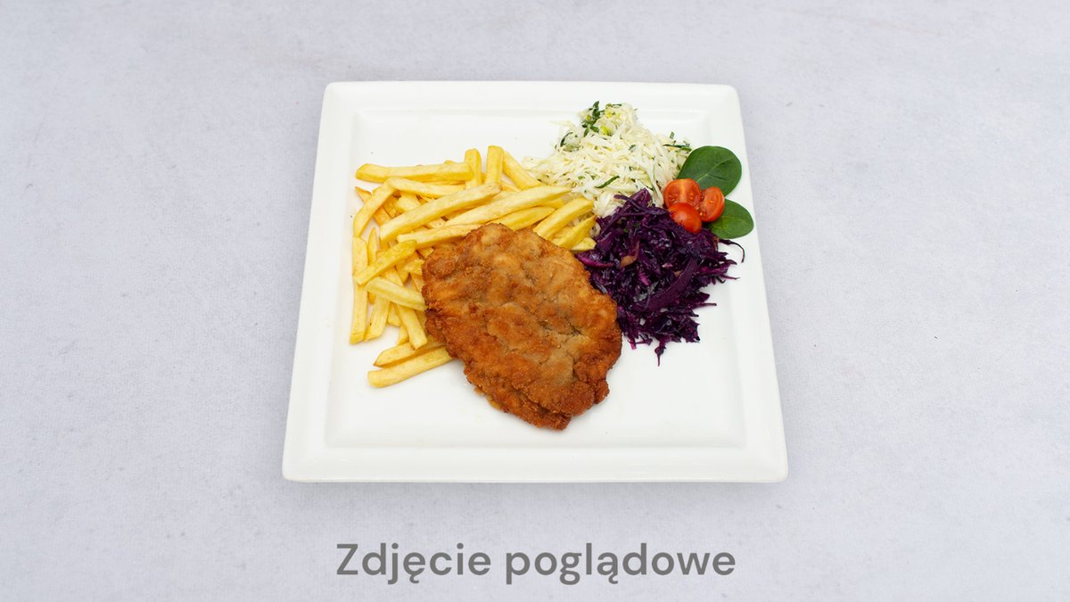 Panierowana pierś z kurczaka, frytki, surówka