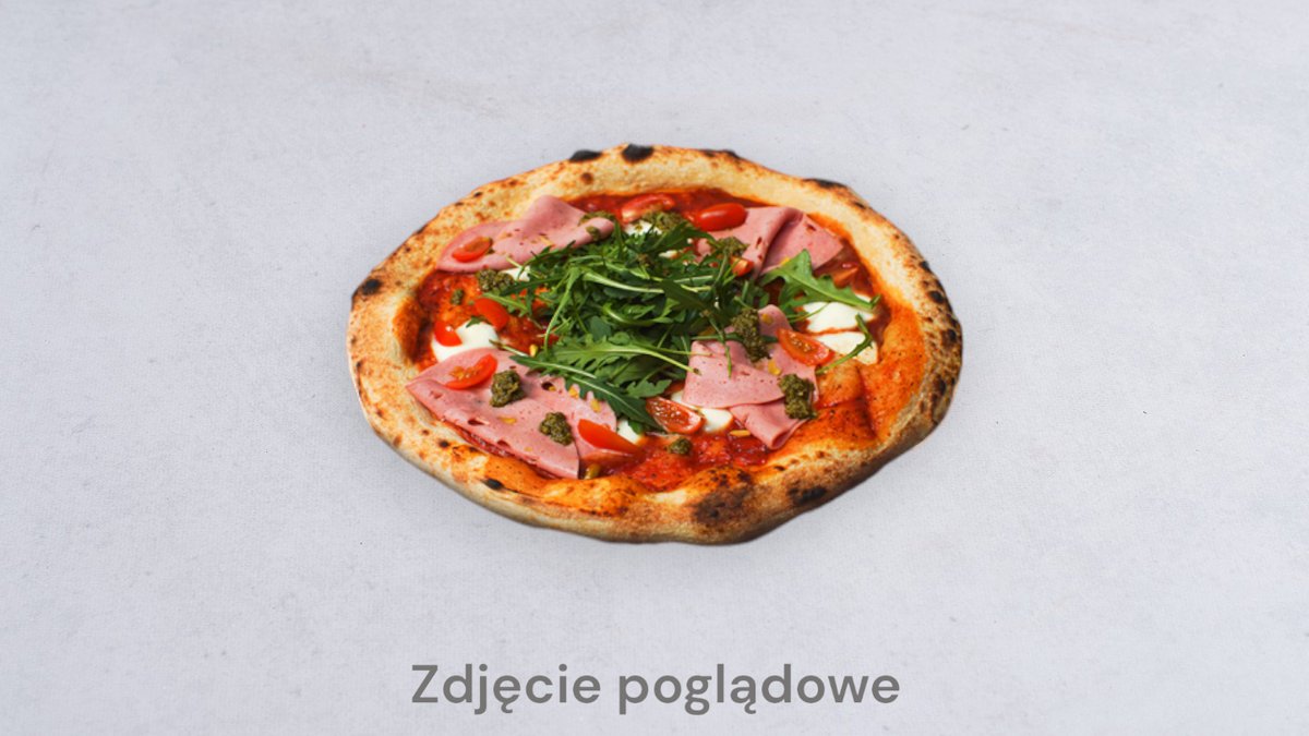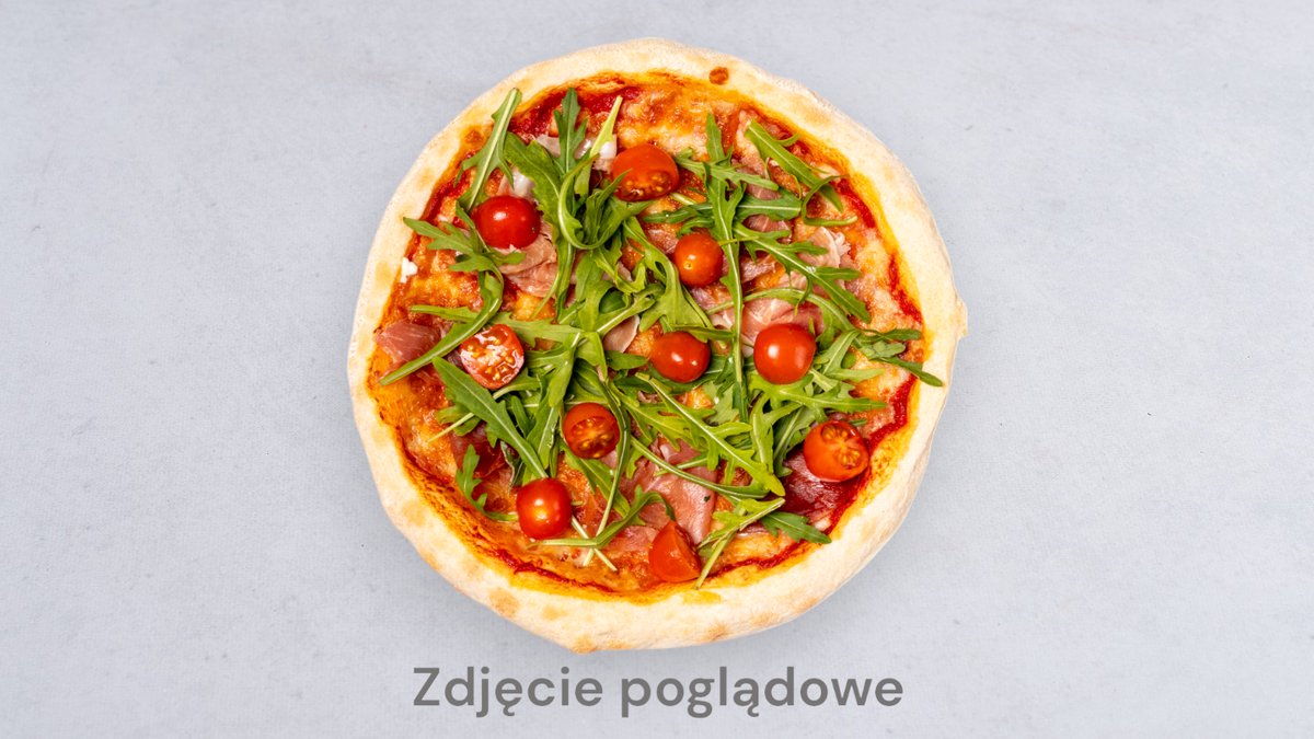 Sos pomidorowy, mozzarella, rukola, pomidorki, szynka prosciutto, parmezan