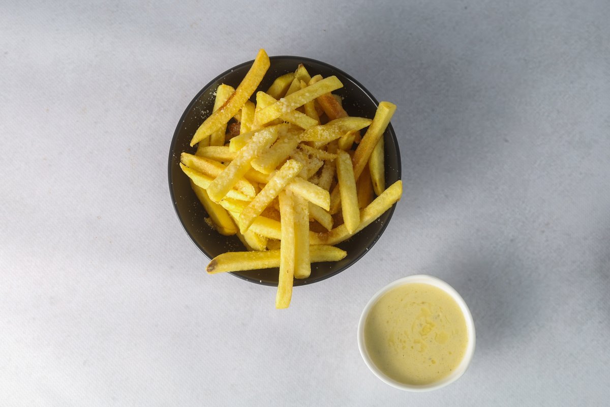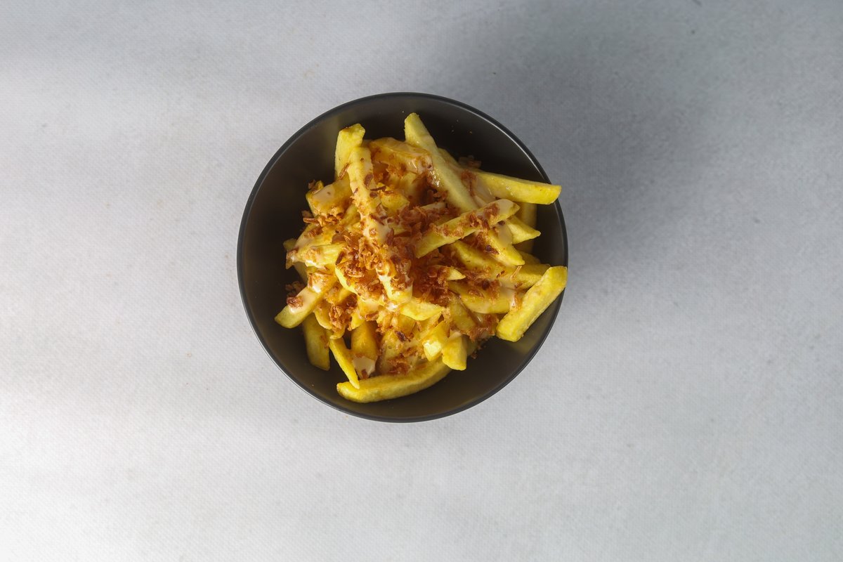 Frytki 250 g, autorski sos kentucky, prażona cebulka