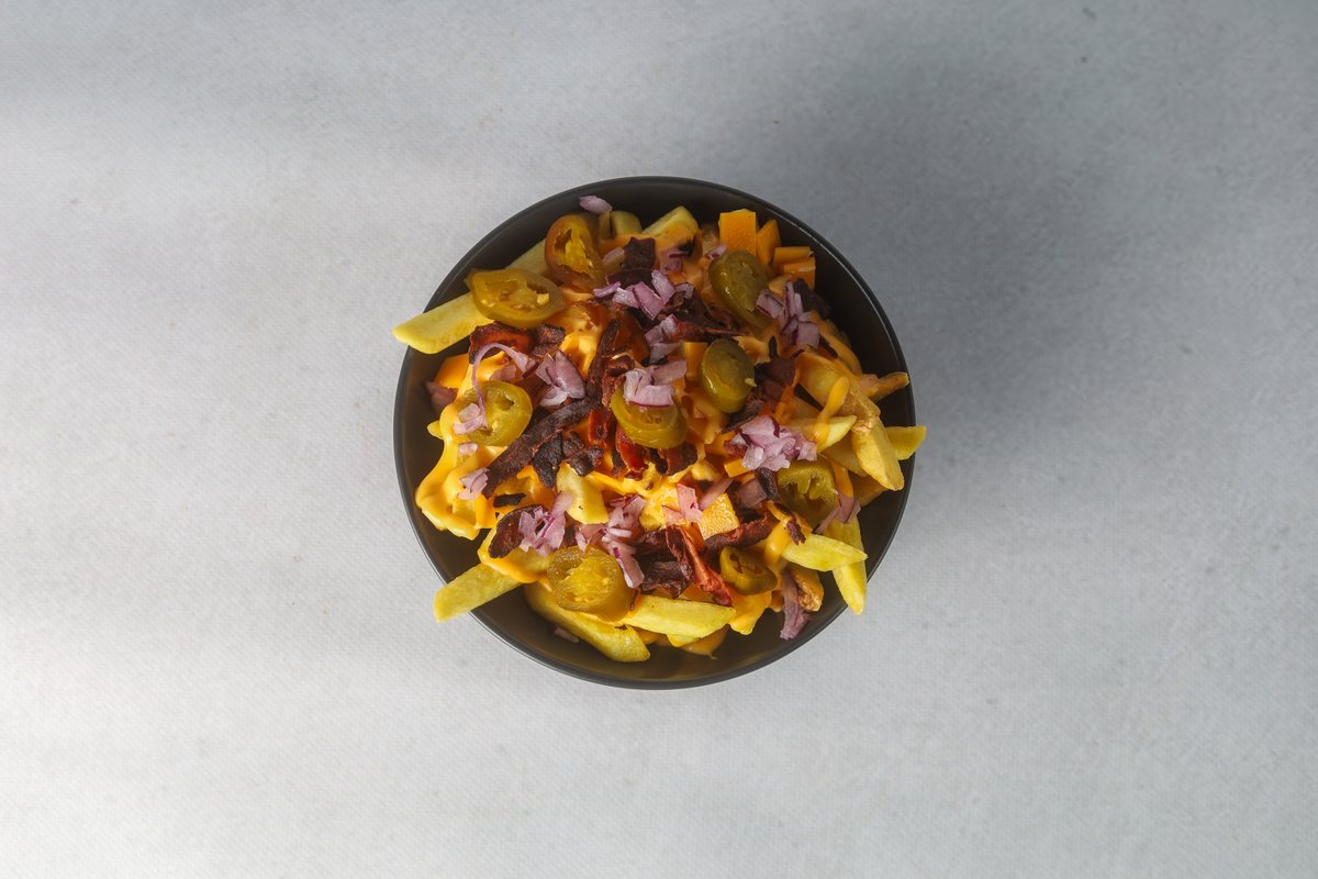 Frytki 250 g, bekon, cheddar, sos serowy, jalapeño, czerwona cebulka