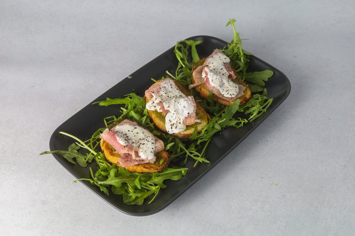 Bagietka, zielone pesto, szynka cotto, stracciatella, świeżo mielony pieprz